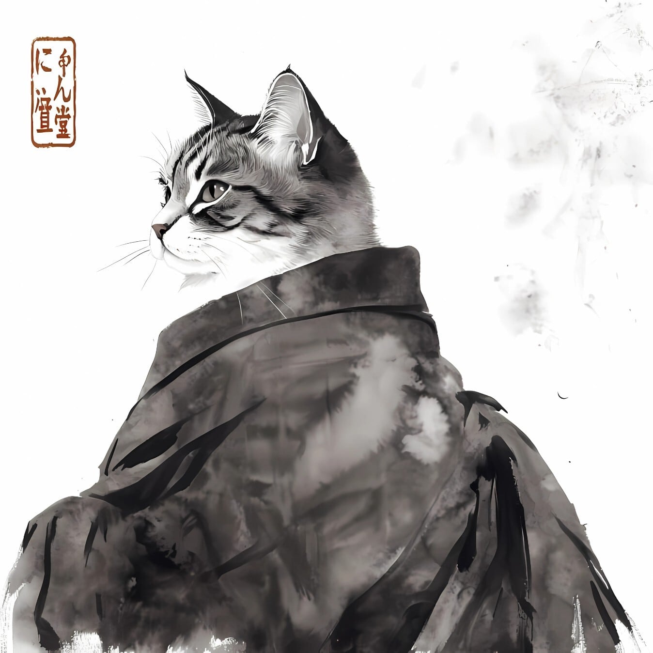 墨絵の風合いで描かれた、着流し姿の和猫。