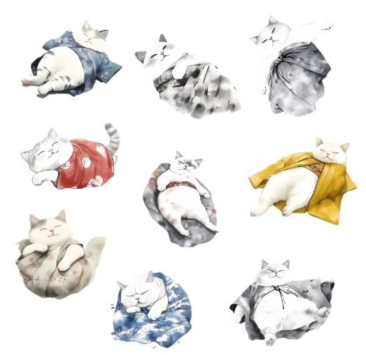 江戸の町からやってきた粋な猫たちが、一番安心したときに見せる「ヘソ天」ポーズでくつろいでいます。