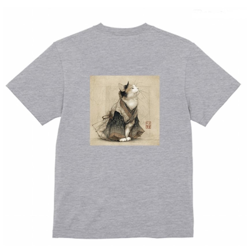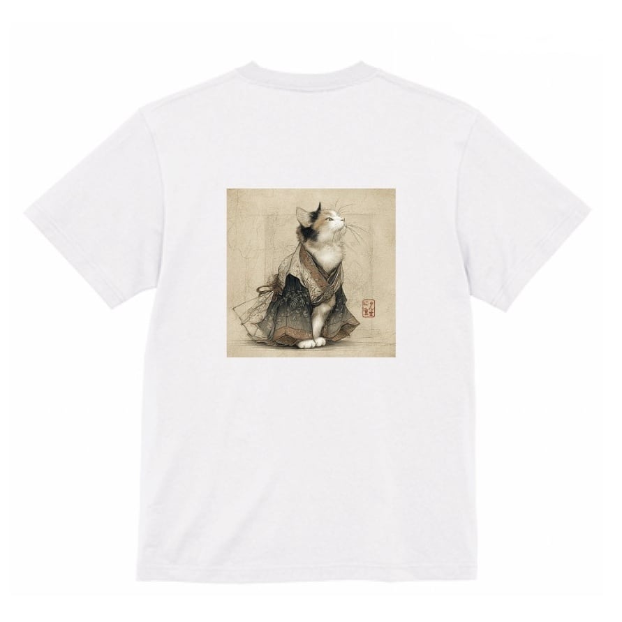 A calico cat is painted with delicate brushstrokes on soft Japanese washi paper.Clad gracefully in an elegant kimono, the cat looks up into the distance, like a beautiful woman painting.This art T-shirt is filled with an elegant and ephemeral charm, evoking the quiet passage of time.