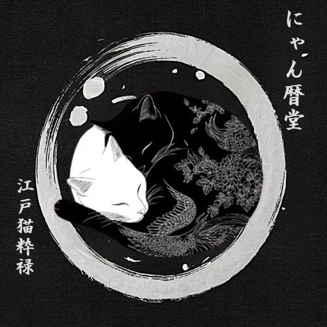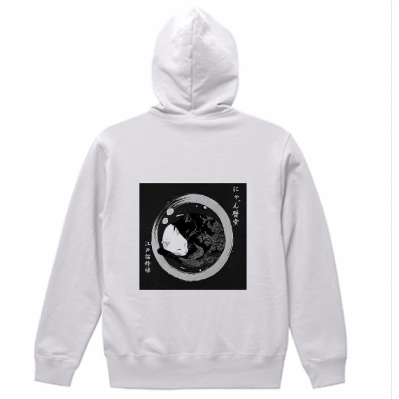 Stillness and movement, black and white, moon and sun.Two Edo cats stand side by side like yin and yang.With a black background and white circles and delicate Japanese patterns,the traditional motifs of cranes and chrysanthemums woven into them embody the aesthetic of Japan.This stylish hoodie embodies this.