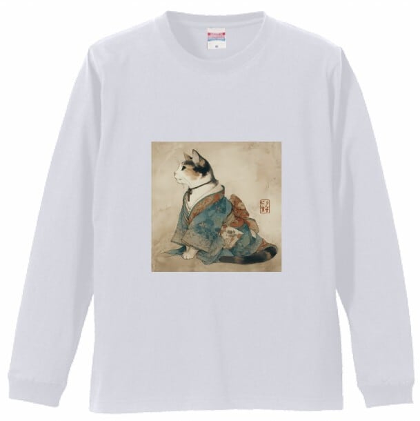 This long-sleeved T-shirt in a soft off-white color features a large print of art of a cat wearing a beautiful antique-style kimono. It exudes an antique vibe, yet is somehow cute.