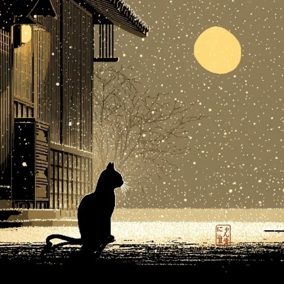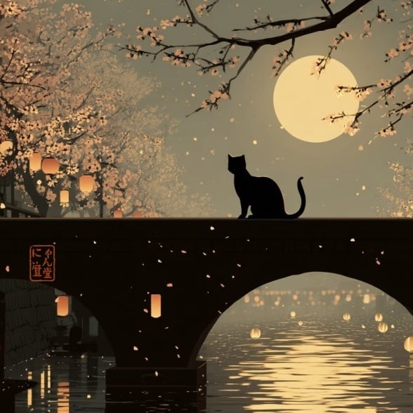 満月に照らされた江戸の町並みと、ふわりと舞う紅葉のコントラストが、心に残る一枚です。